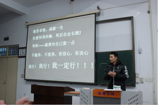 接着,由14级辅导员冯毛弟老师细致的给同学们说明考研的原因及理由。介绍考研群体及考研的内容和考研的准备时间安排表。冯老师重点强调考研的心态:要有恒心和毅力、要乐观和豁达自信。同学们在冯老师的带领下,喊出激烈且振奋人心的考研口号。