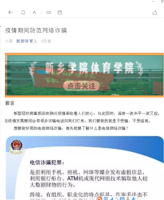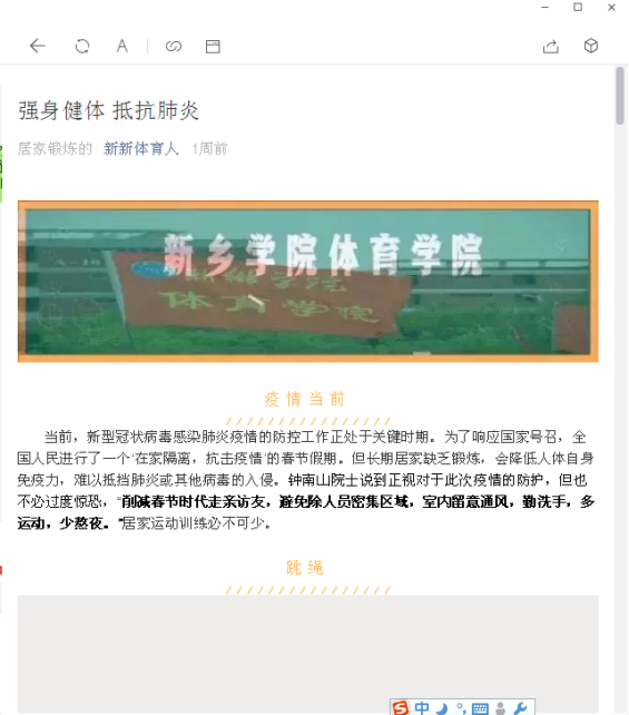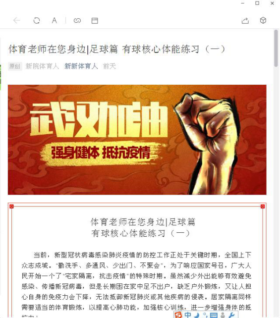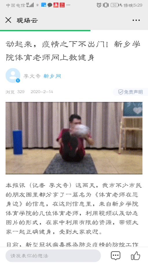 正值我国体育事业大发展,校园体育蓬勃开展之时,疫情席卷,举国抗“疫”,为了居家期间,广大师生与人民身体素质不下降,体育爱好者,特别是青少年对体育热情不减,训练不中断,在党总支的组织与指导下,二支部书记王泉海老师首扛大旗,迅速组成了足球专项“突击队”,足球教师丁勇、李尚华、陈亮、刘佳等同志充分发挥专业特长,广泛调研,在家里充分利用现有的器材、设备录制视频、撰写技术要领与要求等工作,创编体育健康指导专栏。足球人“树榜样、立标杆、做蓝本”,随后组建了篮球、网羽乒、田径、武术体操、体育理论专项“突击队”,工作队伍逐步壮大,内容更加丰富。孟杰同志承担员工管理工作的同时,带领员工党支部制作微信“新新体育人”公众平台图文工作,与教师党支部共同制作《体育老师在您身边》系列专栏,目前“足球篇”已经陆续定期推出,发文首期就被新乡日报等媒体关注并转载报道。
