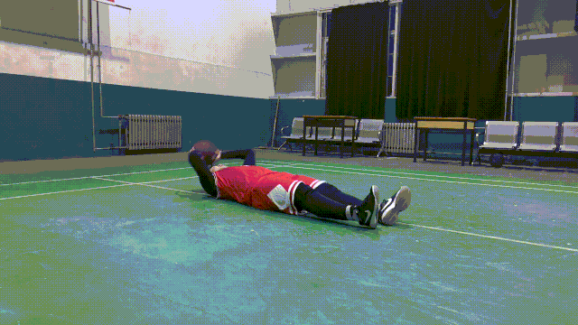 准备动作:将两手一手扶球,一手支撑在地上,两手略宽于肩,双脚并拢,以脚趾点地支撑。