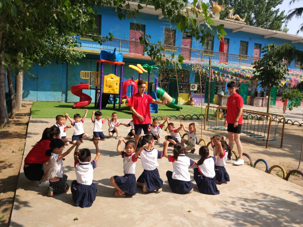 为了此次实践活动,我们准备了很多游戏,李冰老师给我们排了节目,给小朋友也买了很多文具。早上8点从公司出发,9点到达目的地,幼儿园经理很热情的出门迎接,刚入校园,就看见孩子们趴着窗户在教室里高兴地大喊“哥哥姐姐老师们来了”,他们眼神里充满期待与激动。起初,我们先组织孩子们站队发放文具,他们很遵守纪律,没有乱争乱抢,一个一个排着队领;接着,我们分三组分别带领着三个班,进行梅花开几朵,兔子搬家的游戏,学前班的孩子学习蓝精灵舞蹈,天气很热,孩子们还是很积极的配合,大家都完全投入进去,被孩子们的天真、单纯所感染,那一刻陪着他们一块玩、一块背诗、一块唱歌,孩子们满头大汗也没有一个喊热喊累;游戏结束后,开始表演节目,孩子们乖巧的坐在一块,看我们表演,给我们鼓掌;最后,让孩子们进教室,教他们折小兔子,期间的经历称之为艰难曲折也不为过,孩子们的热情打败了困难,每个人都折出了属于自己的小兔子。