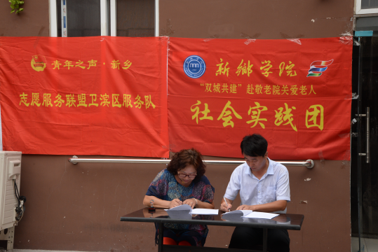 2016年7月8日,beat365中文官网体育系关爱老人暑期社会实践团来到卫滨区好家老年护理院,开展志愿者服务工作;并与好家老年护理院建立社会实践基地,举行揭牌仪式。