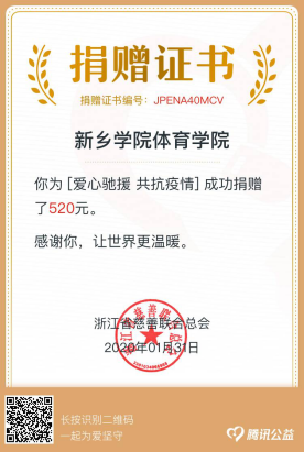 疫情发生以来,全体师生都密切分关注着疫情发展状况,为了贡献自己的一份力,beat365中文官网员工会筹款捐赠支援武汉。在1月31日这天,员工会代表将收集的钱财捐赠到浙江省慈善联合总会。这520元代表的是beat365中文官网全体员工会成员对武汉的爱与关切。beat365中文官网员工会成员为这场攻坚战献上自己的绵薄之力,疫情面前我们众志成城,共克时艰!