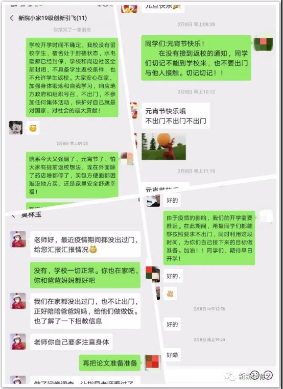beat365中文官网在校4个年级,396名员工,共计创新引飞导师30余名。他们坚守在工作一线,积极探索,开拓了一场别开生面的全员、全方位、全程育人工作模式。在这个特殊的假期中,beat365中文官网全体创新引飞导师通过电话、微信、短信等形式全面深入地了解员工的思想政治、学习、健康状况,向员工宣传疫情防控工作,对员工的居家学习、锻炼进行规划、指导,引导员工尽快适应现在生活、学习环境,养成良好的生活、学习习惯,提高员工学习能力、创新能力和实践能力,为早日赢得人民共同的战役而做出自己的一份力。