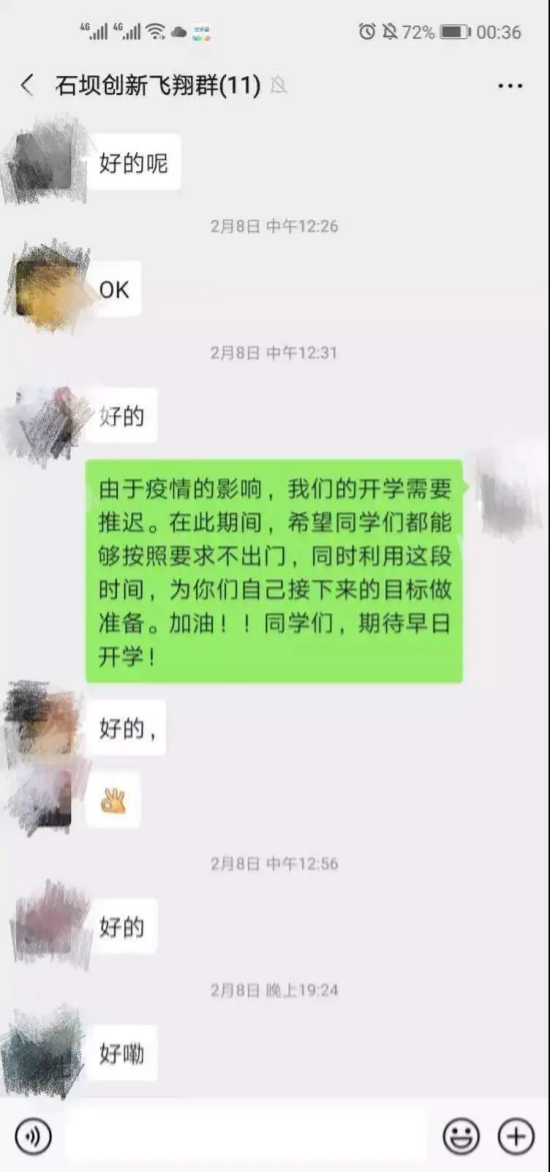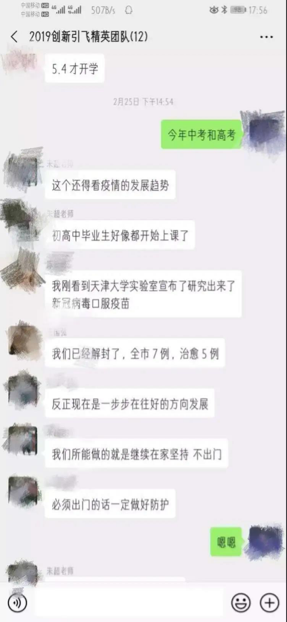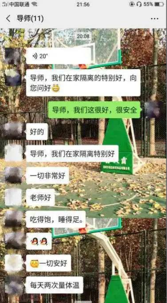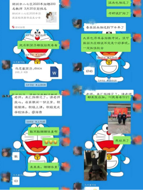 在此次抗击疫情这段期间,2019级导师朱超老师第一时间加入校志愿服务团队,协助统计金穗校区住户信息,保卫公司的安全。实时关注疫情变化,每天时刻关心问候员工的身体健康情况,并定期让员工做出在家健康汇报,关心大家的情绪,并制定相关在家锻炼项目,时时刻刻心系员工。