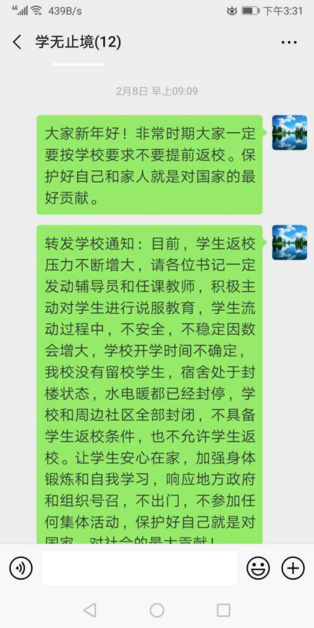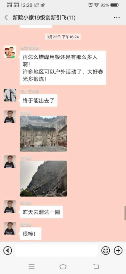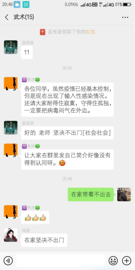 在疫情防控期间,2017级创新引飞导师李冰老师不定时的和员工们进行沟通交流,并通过微信组建的群聊和员工们进行互动,并积极引导员工要正确的认识这次重大疫情;要时刻都充满信心、积极应对;李冰老师就像是老师们的“辅导员”。同时,李冰老师也每日主动对员工们进行询问和安抚,并时常对员工们的学习状况进行检查和监督,告诫员工们在家也不要放松警惕,应该通过此段时间来完善自己的不足,在思想和学业方面都要有所进步,不要停滞不前。